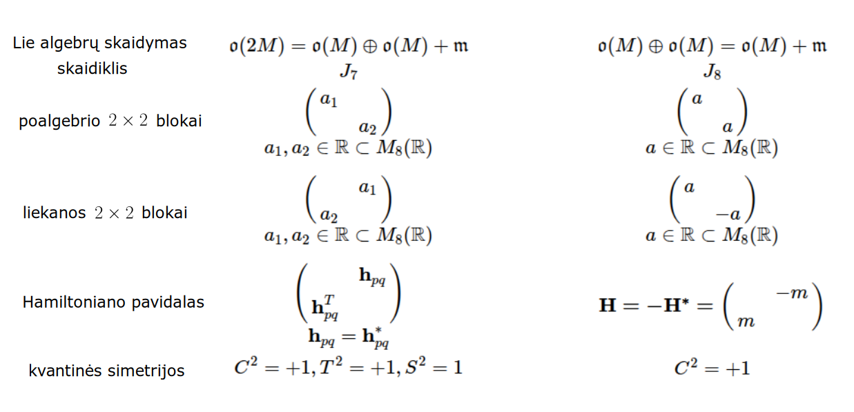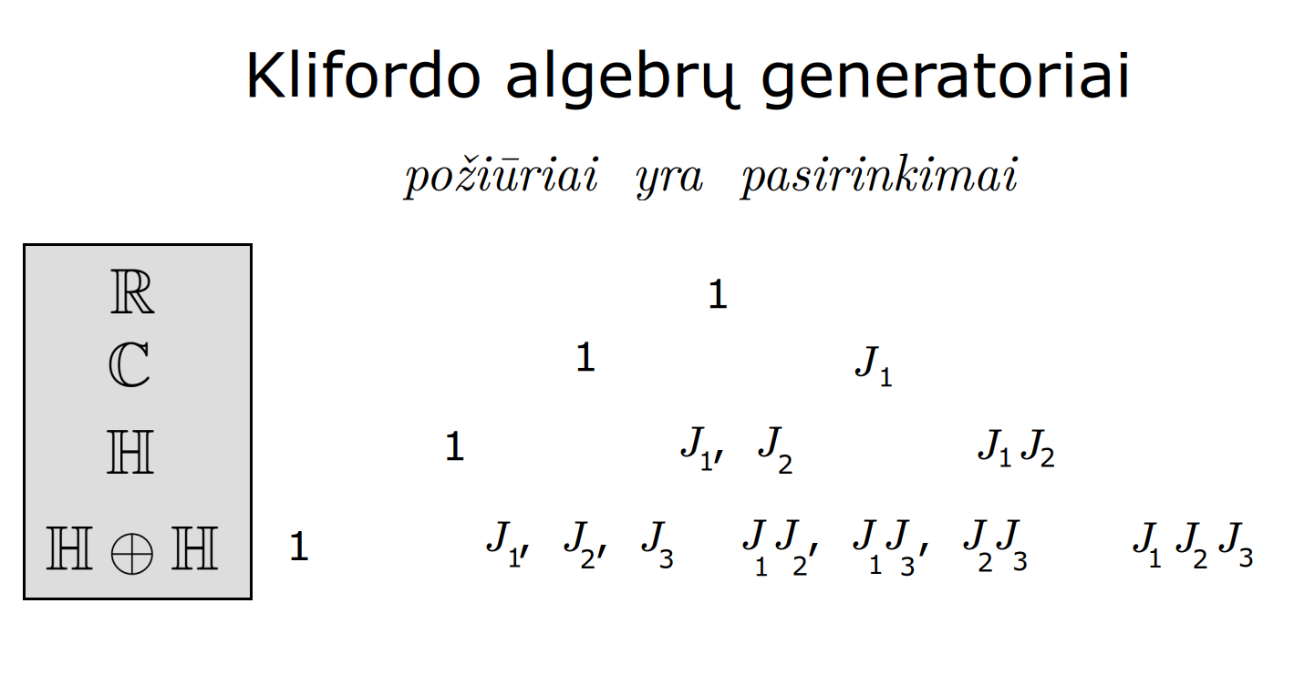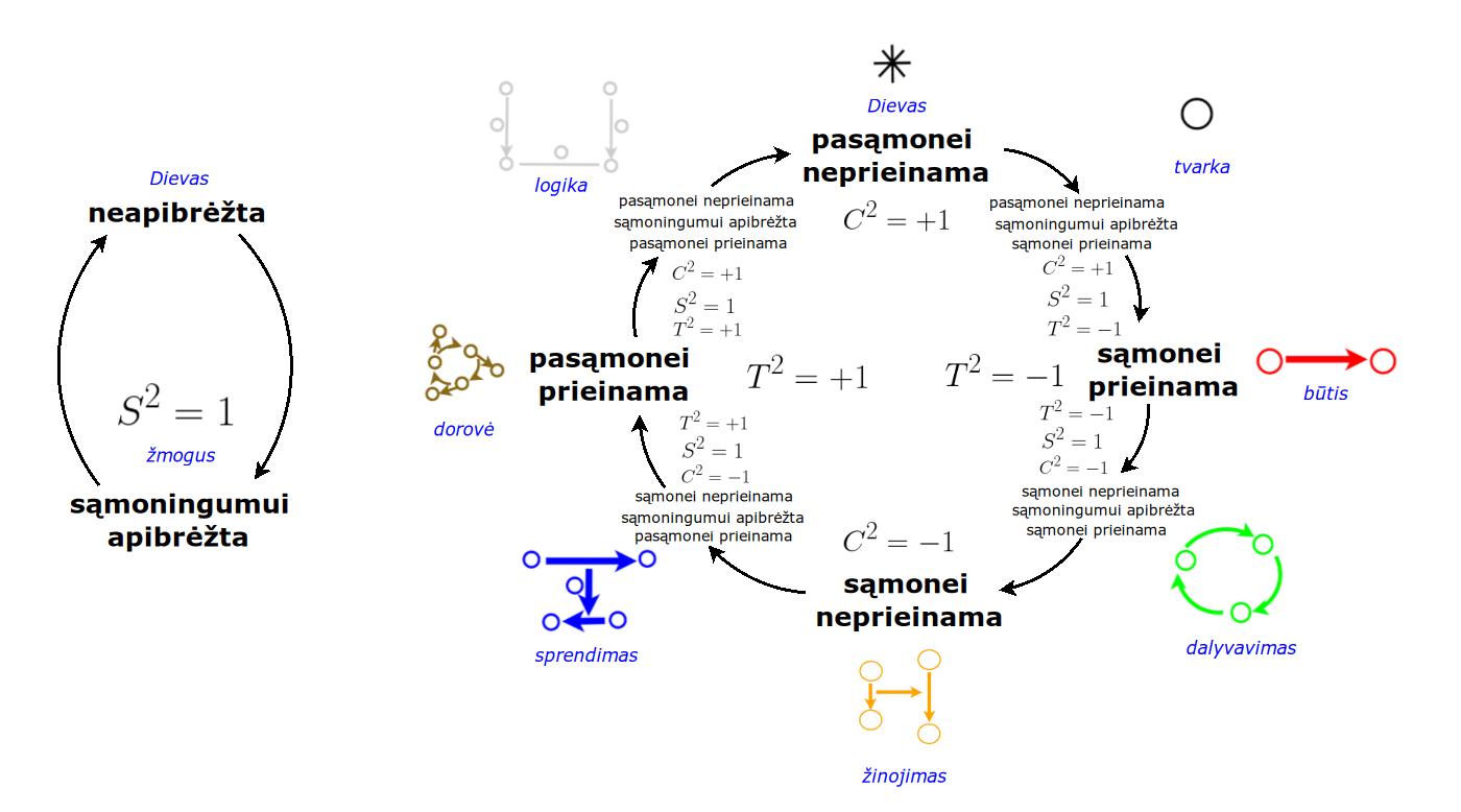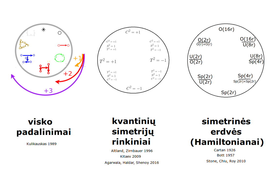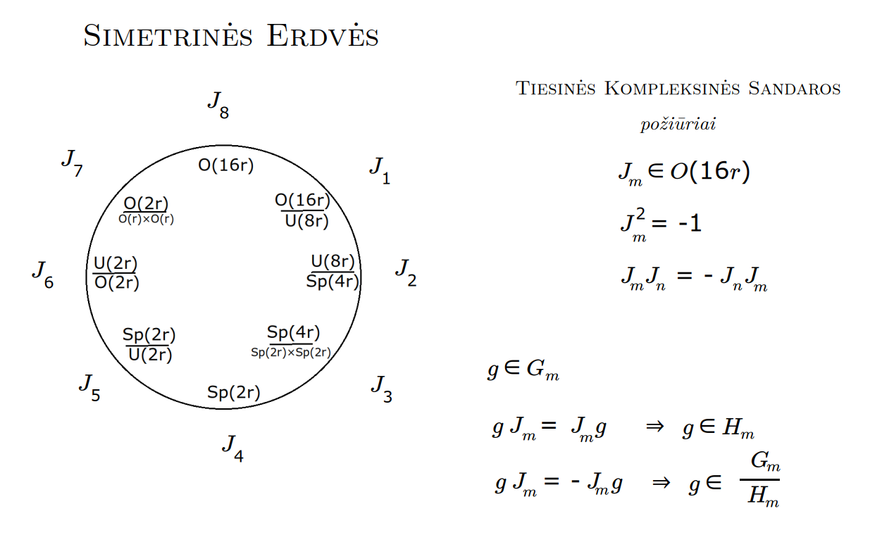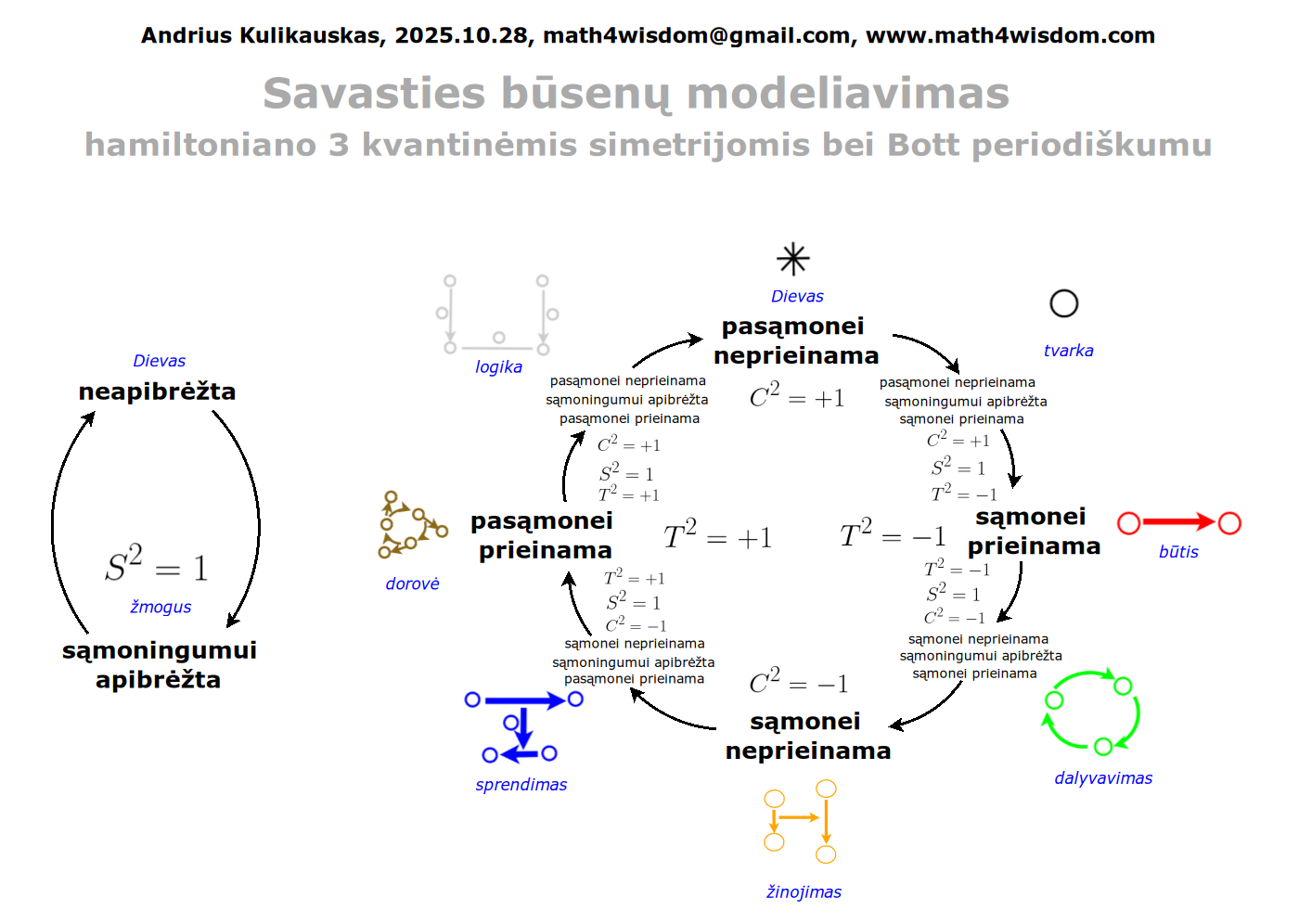 Bott periodicity, VGTU žemėlapis, skaidrės, 2025 m. spalio 28 d., 9:00 val. S6 (SRL-I) 401 An Allegory: The Solipsistic Self as the Hamiltonian of a Noninteracting Fermion Savasties būsenų modeliavimas hamiltoniano 3 kvantinėmis simetrijomis bei Bott periodiškumu Žmogaus vidinis gyvenimas yra sunkiai nusakomas. Kaip jį modeliuoti? Jį pristatome kaip pokalbį tarp trijų sąmoningumo lygmenų, kitaip tariant, trijų protų: atsakančio, klausiančio ir tiriančio, kuriuos žymiu atitinkamai |一, |二, |三. Pasąmonė |一 mums ištisai siūlo vaizdus, patirtis, įspūdžius, nuotaikas, reiškinius, pavyzdžius, galybę atsakymų, ką mes nesąmoningai žinome. Sąmonė |二, atitrūkusi nuo juslių, savo ruožtu pina ryšius tarp sąvokų, žodžių, sampratų, kuriais mes nežinome, užtat sąmoningai klausiame. Visavertis sąmoningumas |三, kuriuo gyvename rūpestingai, apgalvotai, valingai, sulygina pasąmonės žinojimą ir sąmonės nežinojimą, kad galėtumėme viską permąstyti šiais dviem skirtingais pavidalais, užtat bet kokiu atveju rinktis, ar vadovautis nuojauta |一 ar išnagrinėjimu |二. Trijų protų pokalbis įžvelgiamas psichologijoje, neurologijoje, evoliucijoje, o taip pat matematikoje, fizikoje, kibernetikoje bei inžinerijoje: Kalmano filtre, variaciniame autoenkoderyje, laisvosios energijos principe, kvantinėse simetrijose. Atsisakydami visų pasąmonės |一 patirčių bei sąmonės |二 sampratų belieka susitelkti į miglų migloje betūnantį grynų gryniausią sąmoningumą |三, apčiuopiantį pirmaprades proto galimybes, pačias paprasčiausias proto sandaras, viską dalinančius į požiūrius. Atpažįstame būties klausimams reikalingą priešpastatymą (laisvos valios ir likimo), dalyvavimui reikalingą mokymosi ratą (nusistatome, vykdome, permąstome) ir žinojimui reikalingus lygmenis (ar, koks, kaip, kodėl). Galima apibrėžti ir kitus tokius visko padalinimus, o galiausiai pastebėti, kaip subliūkšta aštuntas visko padalinimas, logikos kvadratas, tvirtindamas "visi yra X ir visi nėra X", taip kad santvarka yra tuščia. Užtat visko padalinimai sudaro aštuonių proto aplinkų ratą. Ar toksai ratas pasireiškia matematikoje? Matematikos širdyje, ar tiesiog jos bamboje, yra būtent panašus aštuonių būsenų ratas, realusis Bott periodiškumas, taip pat dviejų būsenų ratas, kompleksinis Bott periodiškumas. Juos galima suprasti dalykiškai kaip Lie algebrų įdėtis o(16r) ⊃ u(8r) ⊃ sp(4r) ⊃ sp(2r) × sp(2r) ⊃ sp(2r) ⊃ u(2r) ⊃ o(2r) ⊃ o(r) × o(r) ⊃ o(r) ir taipogi u(2r) ⊃ u(r) × u(r) ⊃ u(r). Šias įdėtis galima suprasti kaip visko padalinimus tiesinių kompleksinių struktūrų J_1, J_2, ... pagrindu, juos generuojant pagal Stone, Chiu, Roy (2011) receptą. O metafizinę prasmę galima išmąstyti suvokiant, kad abu Bott periodiškumai kartu išreiškia dešimtlypį kelią klasifikuojantį topologinius izoliatorius. Ši klasifikacija išsako kaip nesąveikaujančio fermiono hamiltonianas tenkina trijų kvantinių simetrijų (laiko apsukimo, krūvio sukeitimo, veidrodinio atspindžio) rinkinius, kurių iš viso yra dešimt. Hamiltoniano galimybes išnagrinėja Agarwala, Haldar, Shenoy (2017). Sulyginus šiuos skaičiavimus ir visko padalinimus galima suprasti nesąveikaujančio fermiono Hamiltonianą kaip modeliuojantį mūsų pačių savasčiai būdingas aplinkas, tai yra, būsenas. Šias mintis išdėstau straipsnyje, "An Allegory: The Solipsistic Self as the Hamiltonian of a Noninteracting Fermion" https://www.math4wisdom.com/files/AnAllegory.pdf Andrius Kulikauskas Modeling the States of the Self with 3 Quantum Symmetries of a Hamiltionian and with Bott Periodicity The inner life of a person is difficult to describe. How to model it? We present it as a conversation between three levels of consciousness, in other words, three minds: answering, asking, and investigating. The subconscious |一 continuously offers us images, experiences, impressions, moods, phenomena, examples, a multitude of answers, which we unconsciously know. The conscious |二, detached from the senses, in turn weaves connections between concepts, words, notions, which we do not know, but which we consciously ask. Full-fledged consciousness |三, which we live with care, thoughtfulness, will, compares the knowledge of the subconscious and the ignorance of consciousness, so that we can rethink everything in these two different forms, therefore, in any case, choose whether to be guided by intuition |一 or analysis |二. The conversation of the three minds is seen in psychology, neuroscience, evolution, as well as in mathematics, physics, cybernetics and engineering: the Kalman filter, the variational autoencoder, the free energy principle, quantum symmetries. By abandoning all concepts of the subconscious |一 experiences and consciousness |二, we can only focus on the purest consciousness |三, which lies in the mist of mist, grasping the primordial possibilities of the mind, the simplest structures of the mind, dividing everything into points of view. We recognize the opposition necessary for questions of being (free will and fate), the circle of learning necessary for participation (we determine, we perform, we rethink), and the levels necessary for knowledge (whether, what, how, why). One can define other such divisions of everything, and finally observe how the eighth division of everything, the square of logic, collapses, asserting "all are X and all are not X", so that the system is empty. Instead, the divisions of everything form a circle of eight mental environments. Does such a circle manifest itself in mathematics? At the heart of mathematics, or simply its navel, is precisely a similar circle of eight states, the real Bott periodicity, as well as a circle of two states, the complex Bott periodicity. They can be understood practically as the embeddings of the Lie algebras o(16r) ⊃ u(8r) ⊃ sp(4r) ⊃ sp(2r) × s