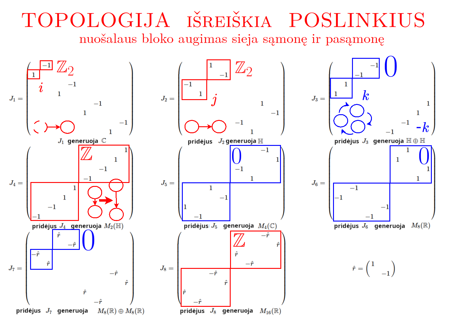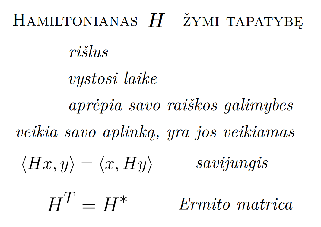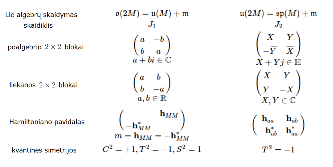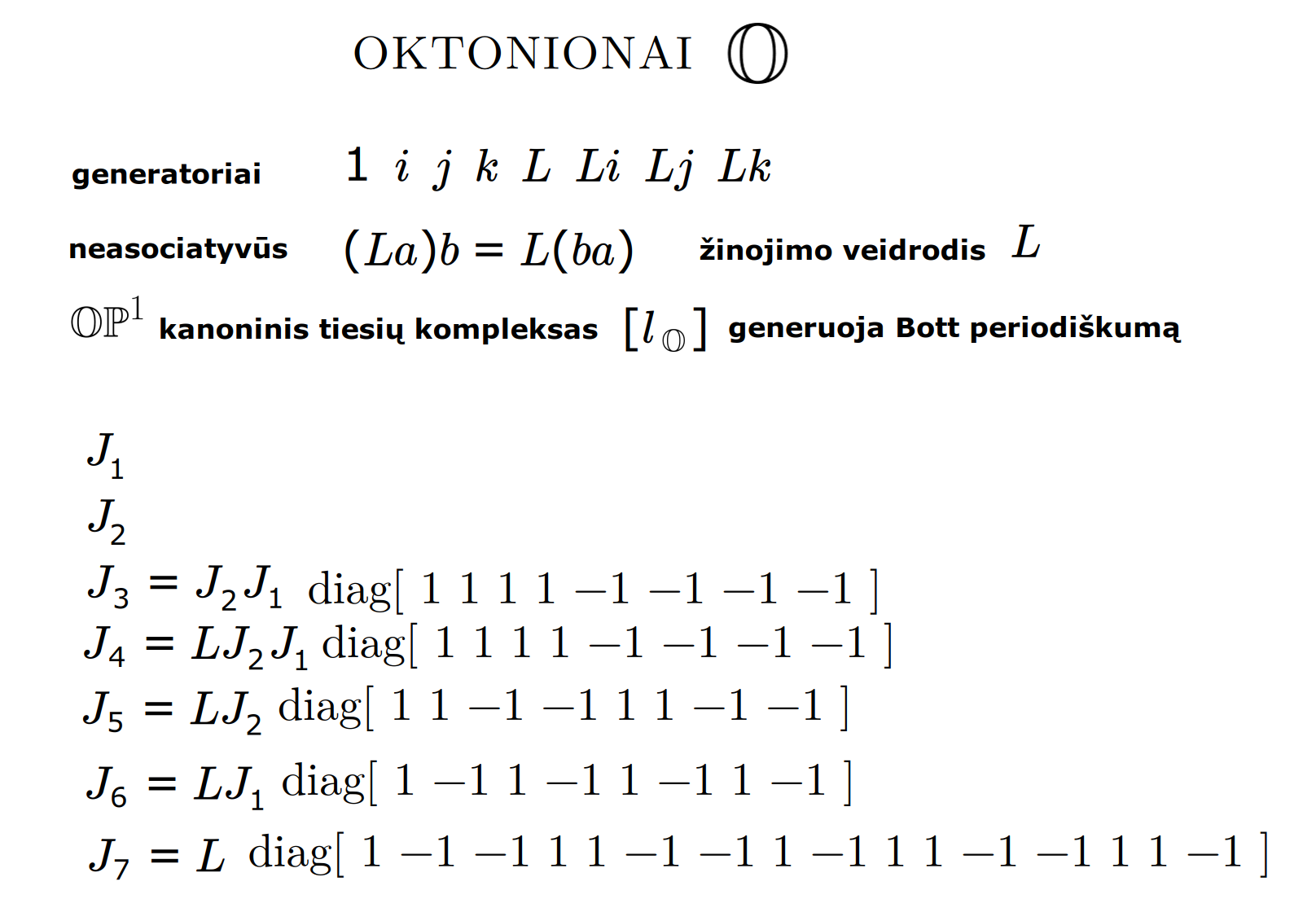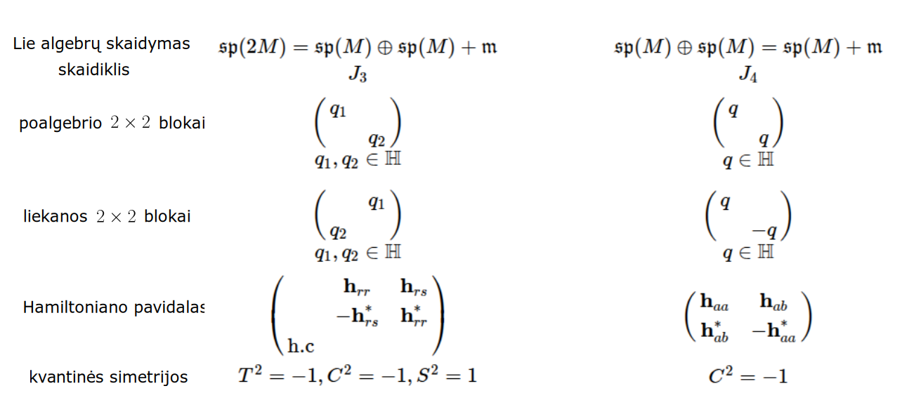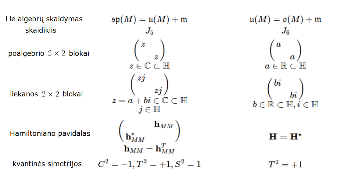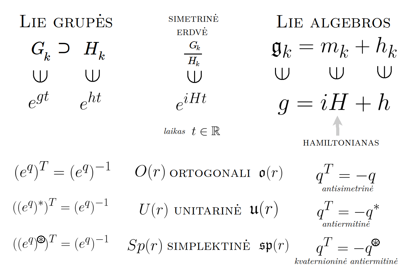 Bott periodicity, VGTU žemėlapis, skaidrės, 2025 m. spalio 28 d., 9:00 val. S6 (SRL-I) 401 An Allegory: The Solipsistic Self as the Hamiltonian of a Noninteracting Fermion Savasties būsenų modeliavimas hamiltoniano 3 kvantinėmis simetrijomis bei Bott periodiškumu Žmogaus vidinis gyvenimas yra sunkiai nusakomas. Kaip jį modeliuoti? Jį pristatome kaip pokalbį tarp trijų sąmoningumo lygmenų, kitaip tariant, trijų protų: atsakančio, klausiančio ir tiriančio, kuriuos žymiu atitinkamai |一, |二, |三. Pasąmonė |一 mums ištisai siūlo vaizdus, patirtis, įspūdžius, nuotaikas, reiškinius, pavyzdžius, galybę atsakymų, ką mes nesąmoningai žinome. Sąmonė |二, atitrūkusi nuo juslių, savo ruožtu pina ryšius tarp sąvokų, žodžių, sampratų, kuriais mes nežinome, užtat sąmoningai klausiame. Visavertis sąmoningumas |三, kuriuo gyvename rūpestingai, apgalvotai, valingai, sulygina pasąmonės žinojimą ir sąmonės nežinojimą, kad galėtumėme viską permąstyti šiais dviem skirtingais pavidalais, užtat bet kokiu atveju rinktis, ar vadovautis nuojauta |一 ar išnagrinėjimu |二. Trijų protų pokalbis įžvelgiamas psichologijoje, neurologijoje, evoliucijoje, o taip pat matematikoje, fizikoje, kibernetikoje bei inžinerijoje: Kalmano filtre, variaciniame autoenkoderyje, laisvosios energijos principe, kvantinėse simetrijose. Atsisakydami visų pasąmonės |一 patirčių bei sąmonės |二 sampratų belieka susitelkti į miglų migloje betūnantį grynų gryniausią sąmoningumą |三, apčiuopiantį pirmaprades proto galimybes, pačias paprasčiausias proto sandaras, viską dalinančius į požiūrius. Atpažįstame būties klausimams reikalingą priešpastatymą (laisvos valios ir likimo), dalyvavimui reikalingą mokymosi ratą (nusistatome, vykdome, permąstome) ir žinojimui reikalingus lygmenis (ar, koks, kaip, kodėl). Galima apibrėžti ir kitus tokius visko padalinimus, o galiausiai pastebėti, kaip subliūkšta aštuntas visko padalinimas, logikos kvadratas, tvirtindamas "visi yra X ir visi nėra X", taip kad santvarka yra tuščia. Užtat visko padalinimai sudaro aštuonių proto aplinkų ratą. Ar toksai ratas pasireiškia matematikoje? Matematikos širdyje, ar tiesiog jos bamboje, yra būtent panašus aštuonių būsenų ratas, realusis Bott periodiškumas, taip pat dviejų būsenų ratas, kompleksinis Bott periodiškumas. Juos galima suprasti dalykiškai kaip Lie algebrų įdėtis o(16r) ⊃ u(8r) ⊃ sp(4r) ⊃ sp(2r) × sp(2r) ⊃ sp(2r) ⊃ u(2r) ⊃ o(2r) ⊃ o(r) × o(r) ⊃ o(r) ir taipogi u(2r) ⊃ u(r) × u(r) ⊃ u(r). Šias įdėtis galima suprasti kaip visko padalinimus tiesinių kompleksinių struktūrų J_1, J_2, ... pagrindu, juos generuojant pagal Stone, Chiu, Roy (2011) receptą. O metafizinę prasmę galima išmąstyti suvokiant, kad abu Bott periodiškumai kartu išreiškia dešimtlypį kelią klasifikuojantį topologinius izoliatorius. Ši klasifikacija išsako kaip nesąveikaujančio fermiono hamiltonianas tenkina trijų kvantinių simetrijų (laiko apsukimo, krūvio sukeitimo, veidrodinio atspindžio) rinkinius, kurių iš viso yra dešimt. Hamiltoniano galimybes išnagrinėja Agarwala, Haldar, Shenoy (2017). Sulyginus šiuos skaičiavimus ir visko padalinimus galima suprasti nesąveikaujančio fermiono Hamiltonianą kaip modeliuojantį mūsų pačių savasčiai būdingas aplinkas, tai yra, būsenas. Šias mintis išdėstau straipsnyje, "An Allegory: The Solipsistic Self as the Hamiltonian of a Noninteracting Fermion" https://www.math4wisdom.com/files/AnAllegory.pdf Andrius Kulikauskas Modeling the States of the Self with 3 Quantum Symmetries of a Hamiltionian and with Bott Periodicity The inner life of a person is difficult to describe. How to model it? We present it as a conversation between three levels of consciousness, in other words, three minds: answering, asking, and investigating. The subconscious |一 continuously offers us images, experiences, impressions, moods, phenomena, examples, a multitude of answers, which we unconsciously know. The conscious |二, detached from the senses, in turn weaves connections between concepts, words, notions, which we do not know, but which we consciously ask. Full-fledged consciousness |三, which we live with care, thoughtfulness, will, compares the knowledge of the subconscious and the ignorance of consciousness, so that we can rethink everything in these two different forms, therefore, in any case, choose whether to be guided by intuition |一 or analysis |二. The conversation of the three minds is seen in psychology, neuroscience, evolution, as well as in mathematics, physics, cybernetics and engineering: the Kalman filter, the variational autoencoder, the free energy principle, quantum symmetries. By abandoning all concepts of the subconscious |一 experiences and consciousness |二, we can only focus on the purest consciousness |三, which lies in the mist of mist, grasping the primordial possibilities of the mind, the simplest structures of the mind, dividing everything into points of view. We recognize the opposition necessary for questions of being (free will and fate), the circle of learning necessary for participation (we determine, we perform, we rethink), and the levels necessary for knowledge (whether, what, how, why). One can define other such divisions of everything, and finally observe how the eighth division of everything, the square of logic, collapses, asserting "all are X and all are not X", so that the system is empty. Instead, the divisions of everything form a circle of eight mental environments. Does such a circle manifest itself in mathematics? At the heart of mathematics, or simply its navel, is precisely a similar circle of eight states, the real Bott periodicity, as well as a circle of two states, the complex Bott periodicity. They can be understood practically as the embeddings of the Lie algebras o(16r) ⊃ u(8r) ⊃ sp(4r) ⊃ sp(2r) × s