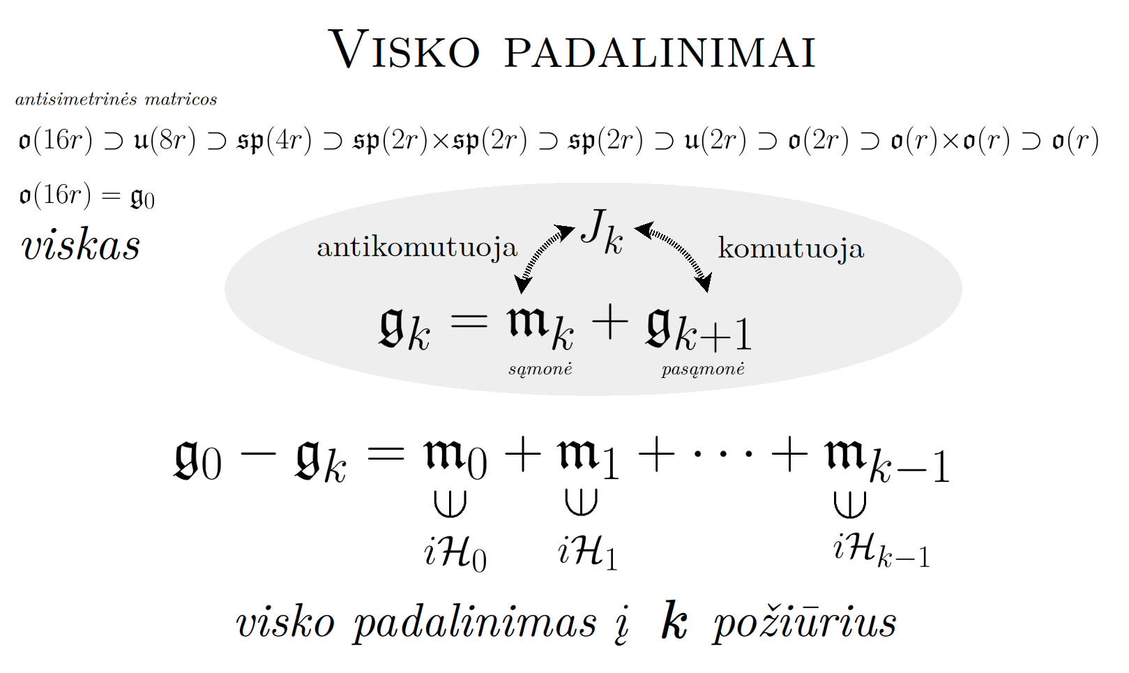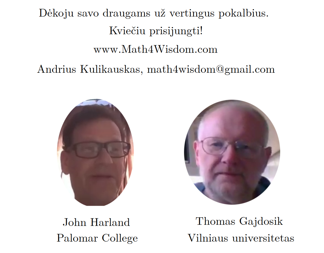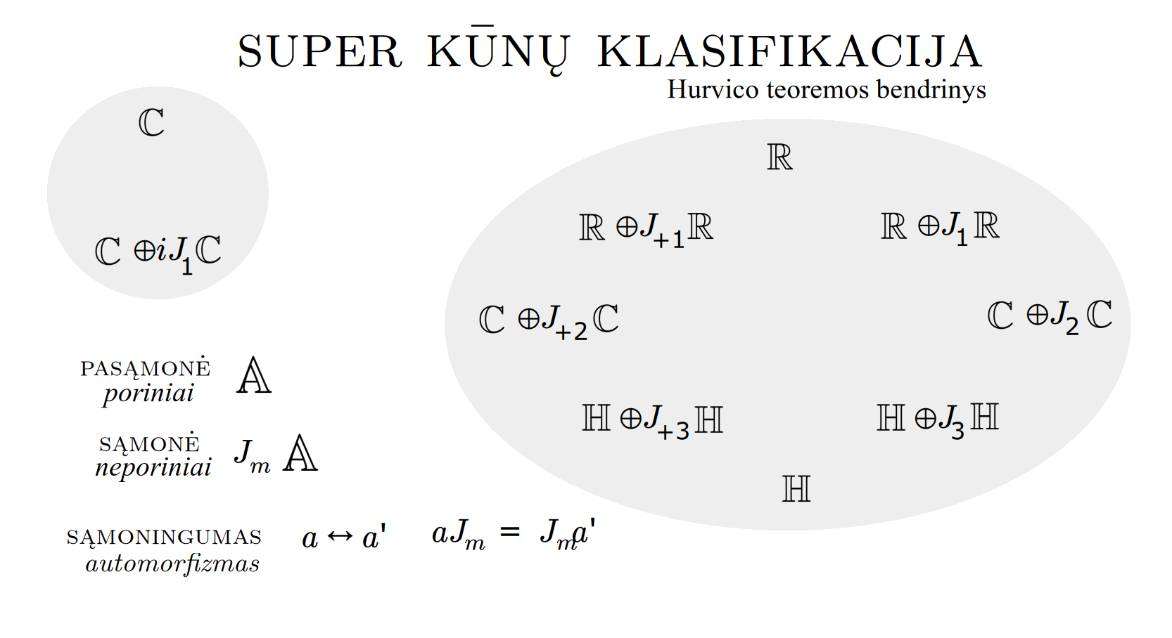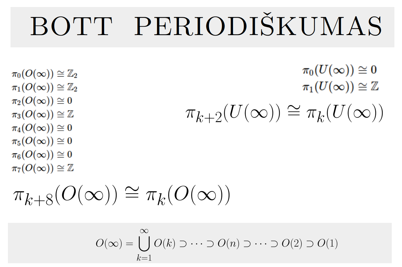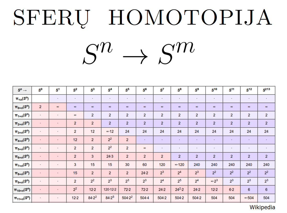 Bott periodicity, VGTU žemėlapis, skaidrės, 2025 m. spalio 28 d., 9:00 val. S6 (SRL-I) 401 An Allegory: The Solipsistic Self as the Hamiltonian of a Noninteracting Fermion Savasties būsenų modeliavimas hamiltoniano 3 kvantinėmis simetrijomis bei Bott periodiškumu Žmogaus vidinis gyvenimas yra sunkiai nusakomas. Kaip jį modeliuoti? Jį pristatome kaip pokalbį tarp trijų sąmoningumo lygmenų, kitaip tariant, trijų protų: atsakančio, klausiančio ir tiriančio, kuriuos žymiu atitinkamai |一, |二, |三. Pasąmonė |一 mums ištisai siūlo vaizdus, patirtis, įspūdžius, nuotaikas, reiškinius, pavyzdžius, galybę atsakymų, ką mes nesąmoningai žinome. Sąmonė |二, atitrūkusi nuo juslių, savo ruožtu pina ryšius tarp sąvokų, žodžių, sampratų, kuriais mes nežinome, užtat sąmoningai klausiame. Visavertis sąmoningumas |三, kuriuo gyvename rūpestingai, apgalvotai, valingai, sulygina pasąmonės žinojimą ir sąmonės nežinojimą, kad galėtumėme viską permąstyti šiais dviem skirtingais pavidalais, užtat bet kokiu atveju rinktis, ar vadovautis nuojauta |一 ar išnagrinėjimu |二. Trijų protų pokalbis įžvelgiamas psichologijoje, neurologijoje, evoliucijoje, o taip pat matematikoje, fizikoje, kibernetikoje bei inžinerijoje: Kalmano filtre, variaciniame autoenkoderyje, laisvosios energijos principe, kvantinėse simetrijose. Atsisakydami visų pasąmonės |一 patirčių bei sąmonės |二 sampratų belieka susitelkti į miglų migloje betūnantį grynų gryniausią sąmoningumą |三, apčiuopiantį pirmaprades proto galimybes, pačias paprasčiausias proto sandaras, viską dalinančius į požiūrius. Atpažįstame būties klausimams reikalingą priešpastatymą (laisvos valios ir likimo), dalyvavimui reikalingą mokymosi ratą (nusistatome, vykdome, permąstome) ir žinojimui reikalingus lygmenis (ar, koks, kaip, kodėl). Galima apibrėžti ir kitus tokius visko padalinimus, o galiausiai pastebėti, kaip subliūkšta aštuntas visko padalinimas, logikos kvadratas, tvirtindamas "visi yra X ir visi nėra X", taip kad santvarka yra tuščia. Užtat visko padalinimai sudaro aštuonių proto aplinkų ratą. Ar toksai ratas pasireiškia matematikoje? Matematikos širdyje, ar tiesiog jos bamboje, yra būtent panašus aštuonių būsenų ratas, realusis Bott periodiškumas, taip pat dviejų būsenų ratas, kompleksinis Bott periodiškumas. Juos galima suprasti dalykiškai kaip Lie algebrų įdėtis o(16r) ⊃ u(8r) ⊃ sp(4r) ⊃ sp(2r) × sp(2r) ⊃ sp(2r) ⊃ u(2r) ⊃ o(2r) ⊃ o(r) × o(r) ⊃ o(r) ir taipogi u(2r) ⊃ u(r) × u(r) ⊃ u(r). Šias įdėtis galima suprasti kaip visko padalinimus tiesinių kompleksinių struktūrų J_1, J_2, ... pagrindu, juos generuojant pagal Stone, Chiu, Roy (2011) receptą. O metafizinę prasmę galima išmąstyti suvokiant, kad abu Bott periodiškumai kartu išreiškia dešimtlypį kelią klasifikuojantį topologinius izoliatorius. Ši klasifikacija išsako kaip nesąveikaujančio fermiono hamiltonianas tenkina trijų kvantinių simetrijų (laiko apsukimo, krūvio sukeitimo, veidrodinio atspindžio) rinkinius, kurių iš viso yra dešimt. Hamiltoniano galimybes išnagrinėja Agarwala, Haldar, Shenoy (2017). Sulyginus šiuos skaičiavimus ir visko padalinimus galima suprasti nesąveikaujančio fermiono Hamiltonianą kaip modeliuojantį mūsų pačių savasčiai būdingas aplinkas, tai yra, būsenas. Šias mintis išdėstau straipsnyje, "An Allegory: The Solipsistic Self as the Hamiltonian of a Noninteracting Fermion" https://www.math4wisdom.com/files/AnAllegory.pdf Andrius Kulikauskas Modeling the States of the Self with 3 Quantum Symmetries of a Hamiltionian and with Bott Periodicity The inner life of a person is difficult to describe. How to model it? We present it as a conversation between three levels of consciousness, in other words, three minds: answering, asking, and investigating. The subconscious |一 continuously offers us images, experiences, impressions, moods, phenomena, examples, a multitude of answers, which we unconsciously know. The conscious |二, detached from the senses, in turn weaves connections between concepts, words, notions, which we do not know, but which we consciously ask. Full-fledged consciousness |三, which we live with care, thoughtfulness, will, compares the knowledge of the subconscious and the ignorance of consciousness, so that we can rethink everything in these two different forms, therefore, in any case, choose whether to be guided by intuition |一 or analysis |二. The conversation of the three minds is seen in psychology, neuroscience, evolution, as well as in mathematics, physics, cybernetics and engineering: the Kalman filter, the variational autoencoder, the free energy principle, quantum symmetries. By abandoning all concepts of the subconscious |一 experiences and consciousness |二, we can only focus on the purest consciousness |三, which lies in the mist of mist, grasping the primordial possibilities of the mind, the simplest structures of the mind, dividing everything into points of view. We recognize the opposition necessary for questions of being (free will and fate), the circle of learning necessary for participation (we determine, we perform, we rethink), and the levels necessary for knowledge (whether, what, how, why). One can define other such divisions of everything, and finally observe how the eighth division of everything, the square of logic, collapses, asserting "all are X and all are not X", so that the system is empty. Instead, the divisions of everything form a circle of eight mental environments. Does such a circle manifest itself in mathematics? At the heart of mathematics, or simply its navel, is precisely a similar circle of eight states, the real Bott periodicity, as well as a circle of two states, the complex Bott periodicity. They can be understood practically as the embeddings of the Lie algebras o(16r) ⊃ u(8r) ⊃ sp(4r) ⊃ sp(2r) × s