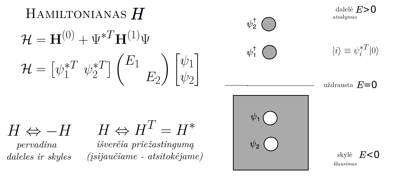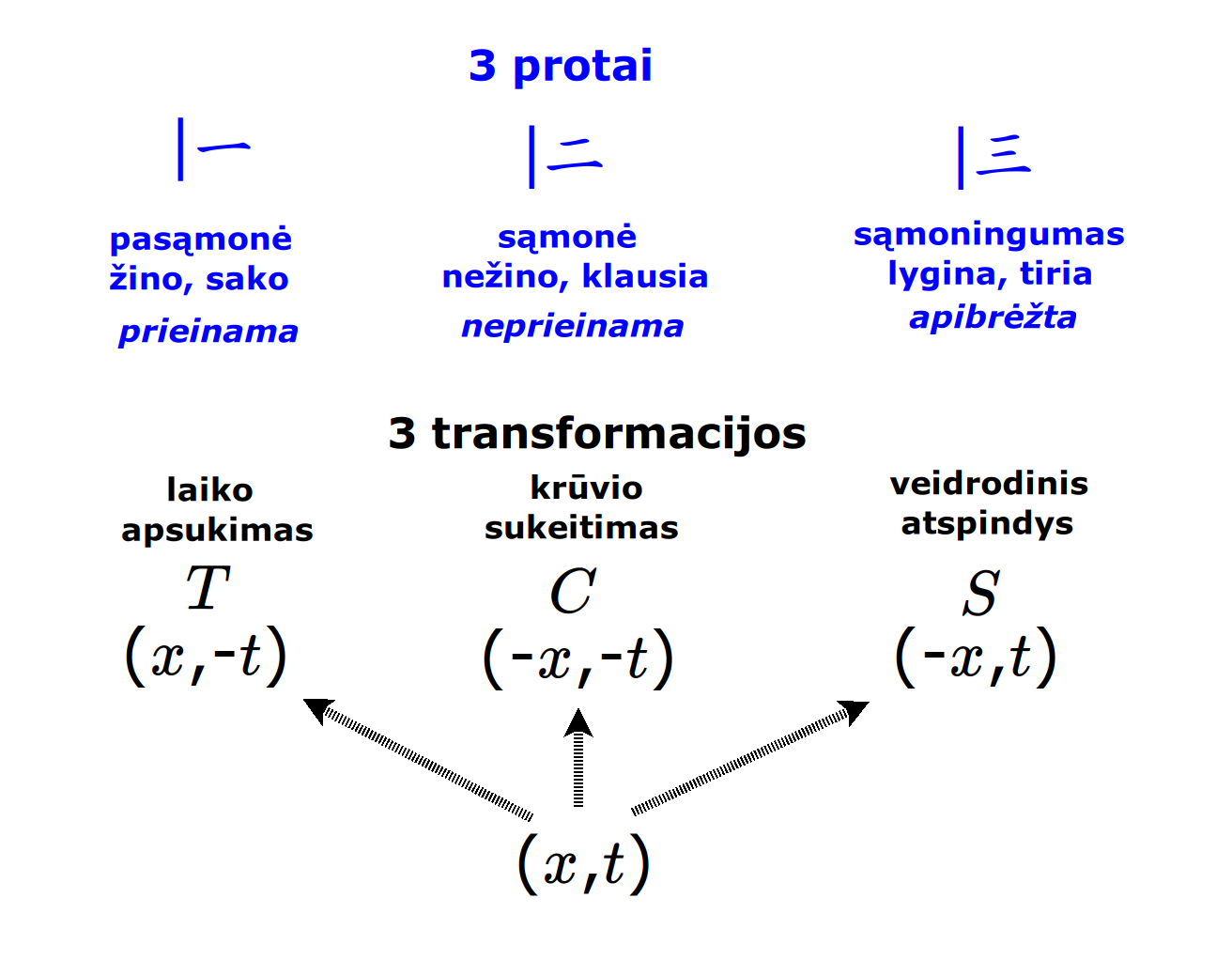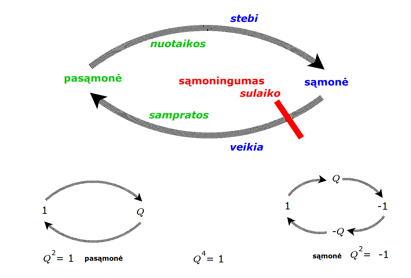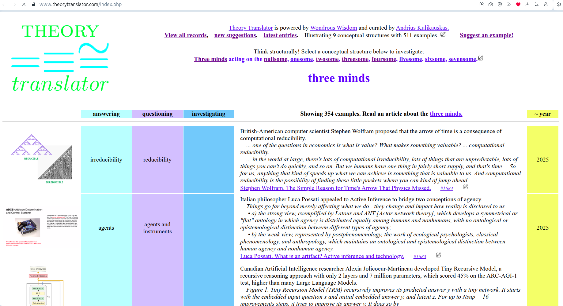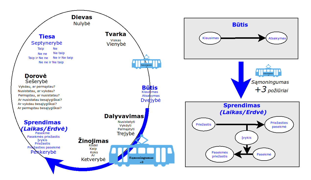 Bott periodicity, VGTU žemėlapis, skaidrės, 2025 m. spalio 28 d., 9:00 val. S6 (SRL-I) 401 An Allegory: The Solipsistic Self as the Hamiltonian of a Noninteracting Fermion Savasties būsenų modeliavimas hamiltoniano 3 kvantinėmis simetrijomis bei Bott periodiškumu Žmogaus vidinis gyvenimas yra sunkiai nusakomas. Kaip jį modeliuoti? Jį pristatome kaip pokalbį tarp trijų sąmoningumo lygmenų, kitaip tariant, trijų protų: atsakančio, klausiančio ir tiriančio, kuriuos žymiu atitinkamai |一, |二, |三. Pasąmonė |一 mums ištisai siūlo vaizdus, patirtis, įspūdžius, nuotaikas, reiškinius, pavyzdžius, galybę atsakymų, ką mes nesąmoningai žinome. Sąmonė |二, atitrūkusi nuo juslių, savo ruožtu pina ryšius tarp sąvokų, žodžių, sampratų, kuriais mes nežinome, užtat sąmoningai klausiame. Visavertis sąmoningumas |三, kuriuo gyvename rūpestingai, apgalvotai, valingai, sulygina pasąmonės žinojimą ir sąmonės nežinojimą, kad galėtumėme viską permąstyti šiais dviem skirtingais pavidalais, užtat bet kokiu atveju rinktis, ar vadovautis nuojauta |一 ar išnagrinėjimu |二. Trijų protų pokalbis įžvelgiamas psichologijoje, neurologijoje, evoliucijoje, o taip pat matematikoje, fizikoje, kibernetikoje bei inžinerijoje: Kalmano filtre, variaciniame autoenkoderyje, laisvosios energijos principe, kvantinėse simetrijose. Atsisakydami visų pasąmonės |一 patirčių bei sąmonės |二 sampratų belieka susitelkti į miglų migloje betūnantį grynų gryniausią sąmoningumą |三, apčiuopiantį pirmaprades proto galimybes, pačias paprasčiausias proto sandaras, viską dalinančius į požiūrius. Atpažįstame būties klausimams reikalingą priešpastatymą (laisvos valios ir likimo), dalyvavimui reikalingą mokymosi ratą (nusistatome, vykdome, permąstome) ir žinojimui reikalingus lygmenis (ar, koks, kaip, kodėl). Galima apibrėžti ir kitus tokius visko padalinimus, o galiausiai pastebėti, kaip subliūkšta aštuntas visko padalinimas, logikos kvadratas, tvirtindamas "visi yra X ir visi nėra X", taip kad santvarka yra tuščia. Užtat visko padalinimai sudaro aštuonių proto aplinkų ratą. Ar toksai ratas pasireiškia matematikoje? Matematikos širdyje, ar tiesiog jos bamboje, yra būtent panašus aštuonių būsenų ratas, realusis Bott periodiškumas, taip pat dviejų būsenų ratas, kompleksinis Bott periodiškumas. Juos galima suprasti dalykiškai kaip Lie algebrų įdėtis o(16r) ⊃ u(8r) ⊃ sp(4r) ⊃ sp(2r) × sp(2r) ⊃ sp(2r) ⊃ u(2r) ⊃ o(2r) ⊃ o(r) × o(r) ⊃ o(r) ir taipogi u(2r) ⊃ u(r) × u(r) ⊃ u(r). Šias įdėtis galima suprasti kaip visko padalinimus tiesinių kompleksinių struktūrų J_1, J_2, ... pagrindu, juos generuojant pagal Stone, Chiu, Roy (2011) receptą. O metafizinę prasmę galima išmąstyti suvokiant, kad abu Bott periodiškumai kartu išreiškia dešimtlypį kelią klasifikuojantį topologinius izoliatorius. Ši klasifikacija išsako kaip nesąveikaujančio fermiono hamiltonianas tenkina trijų kvantinių simetrijų (laiko apsukimo, krūvio sukeitimo, veidrodinio atspindžio) rinkinius, kurių iš viso yra dešimt. Hamiltoniano galimybes išnagrinėja Agarwala, Haldar, Shenoy (2017). Sulyginus šiuos skaičiavimus ir visko padalinimus galima suprasti nesąveikaujančio fermiono Hamiltonianą kaip modeliuojantį mūsų pačių savasčiai būdingas aplinkas, tai yra, būsenas. Šias mintis išdėstau straipsnyje, "An Allegory: The Solipsistic Self as the Hamiltonian of a Noninteracting Fermion" https://www.math4wisdom.com/files/AnAllegory.pdf Andrius Kulikauskas Modeling the States of the Self with 3 Quantum Symmetries of a Hamiltionian and with Bott Periodicity The inner life of a person is difficult to describe. How to model it? We present it as a conversation between three levels of consciousness, in other words, three minds: answering, asking, and investigating. The subconscious |一 continuously offers us images, experiences, impressions, moods, phenomena, examples, a multitude of answers, which we unconsciously know. The conscious |二, detached from the senses, in turn weaves connections between concepts, words, notions, which we do not know, but which we consciously ask. Full-fledged consciousness |三, which we live with care, thoughtfulness, will, compares the knowledge of the subconscious and the ignorance of consciousness, so that we can rethink everything in these two different forms, therefore, in any case, choose whether to be guided by intuition |一 or analysis |二. The conversation of the three minds is seen in psychology, neuroscience, evolution, as well as in mathematics, physics, cybernetics and engineering: the Kalman filter, the variational autoencoder, the free energy principle, quantum symmetries. By abandoning all concepts of the subconscious |一 experiences and consciousness |二, we can only focus on the purest consciousness |三, which lies in the mist of mist, grasping the primordial possibilities of the mind, the simplest structures of the mind, dividing everything into points of view. We recognize the opposition necessary for questions of being (free will and fate), the circle of learning necessary for participation (we determine, we perform, we rethink), and the levels necessary for knowledge (whether, what, how, why). One can define other such divisions of everything, and finally observe how the eighth division of everything, the square of logic, collapses, asserting "all are X and all are not X", so that the system is empty. Instead, the divisions of everything form a circle of eight mental environments. Does such a circle manifest itself in mathematics? At the heart of mathematics, or simply its navel, is precisely a similar circle of eight states, the real Bott periodicity, as well as a circle of two states, the complex Bott periodicity. They can be understood practically as the embeddings of the Lie algebras o(16r) ⊃ u(8r) ⊃ sp(4r) ⊃ sp(2r) × s