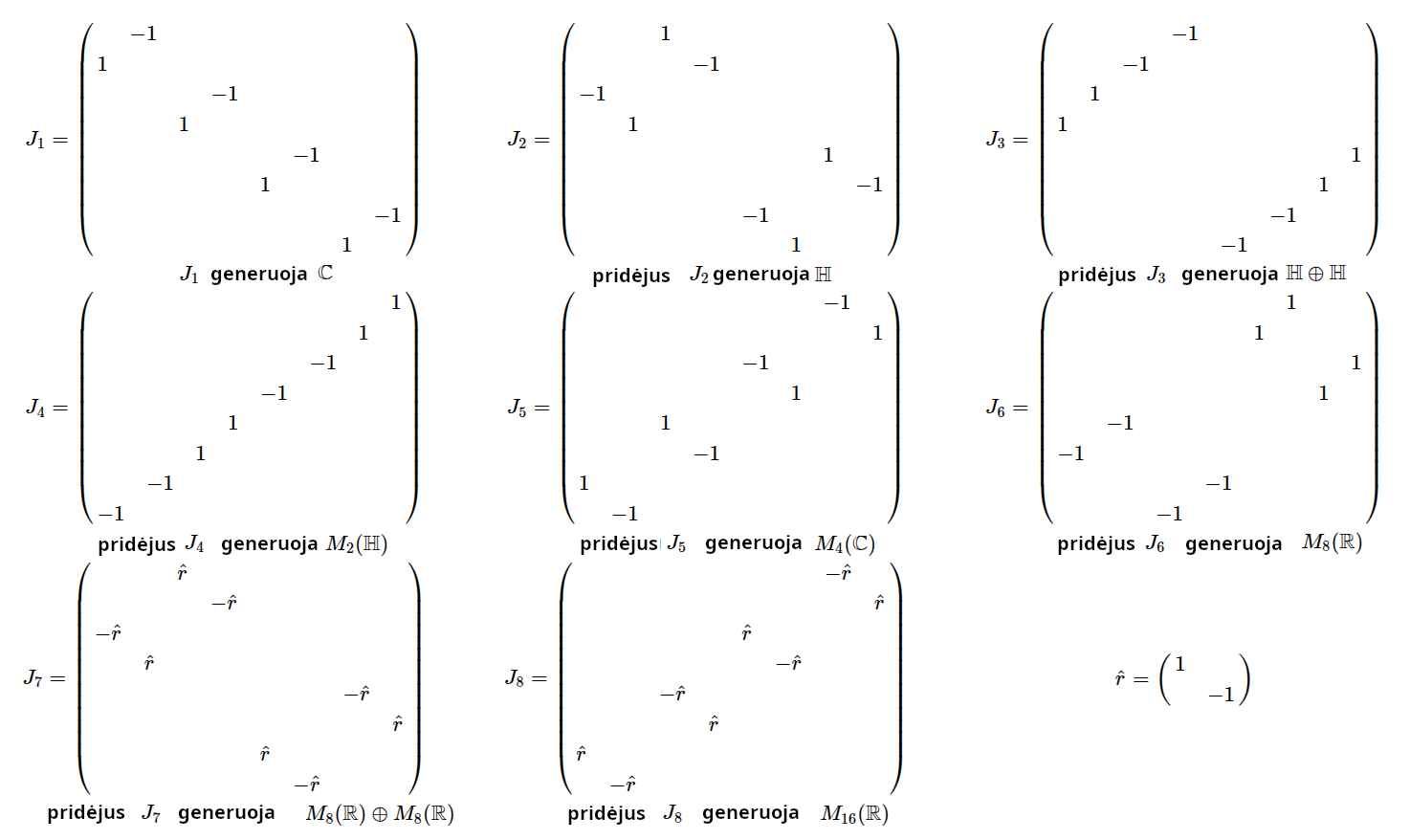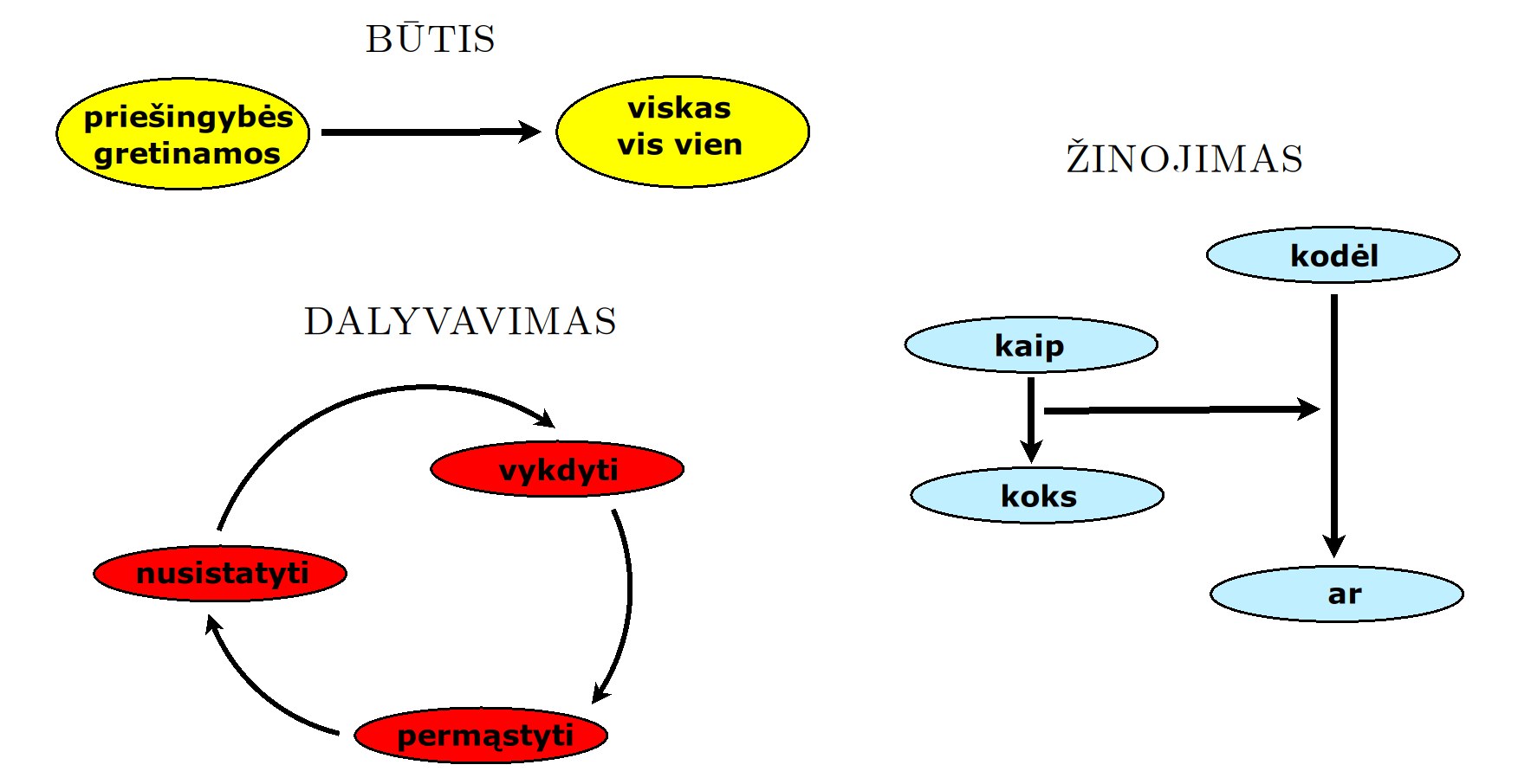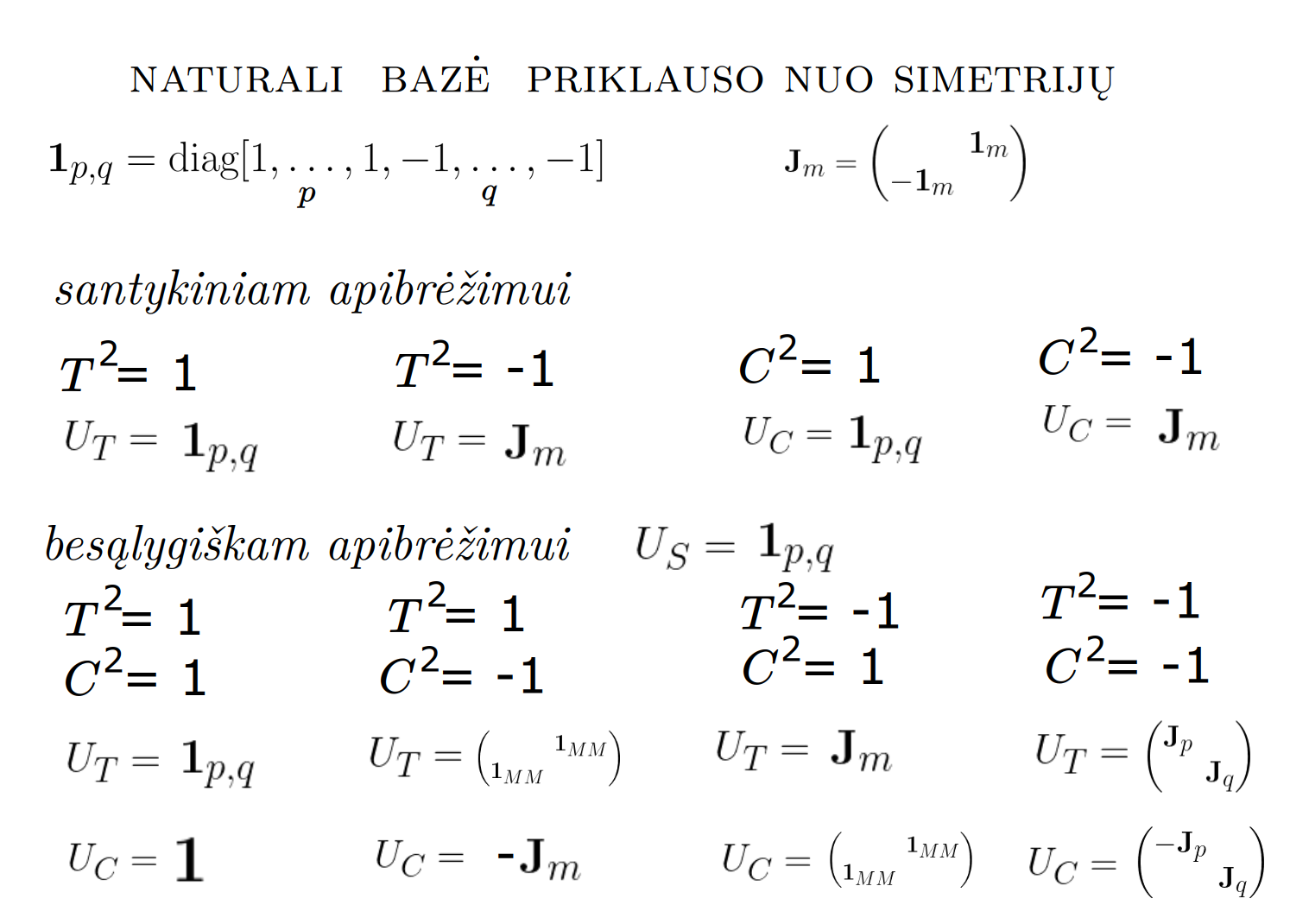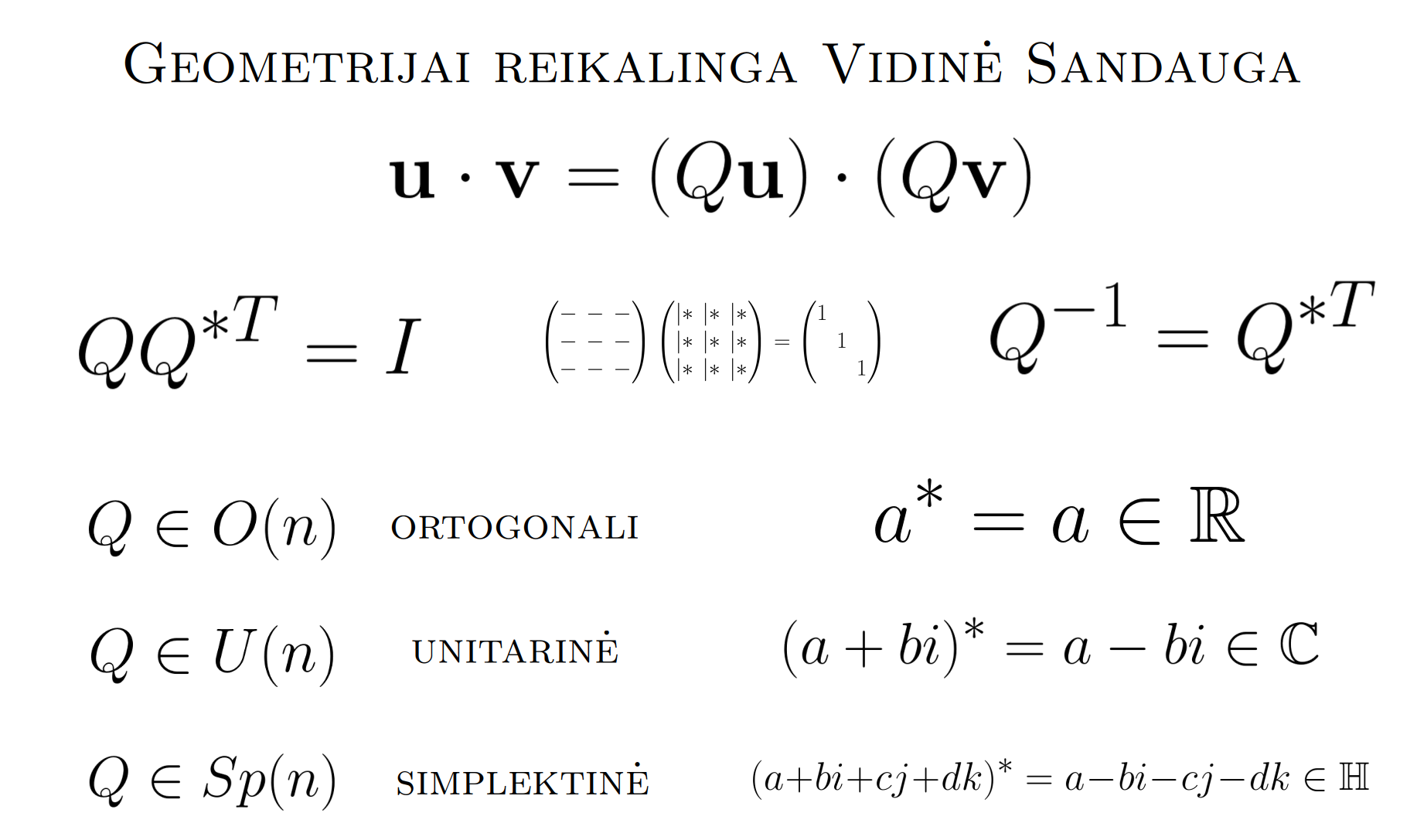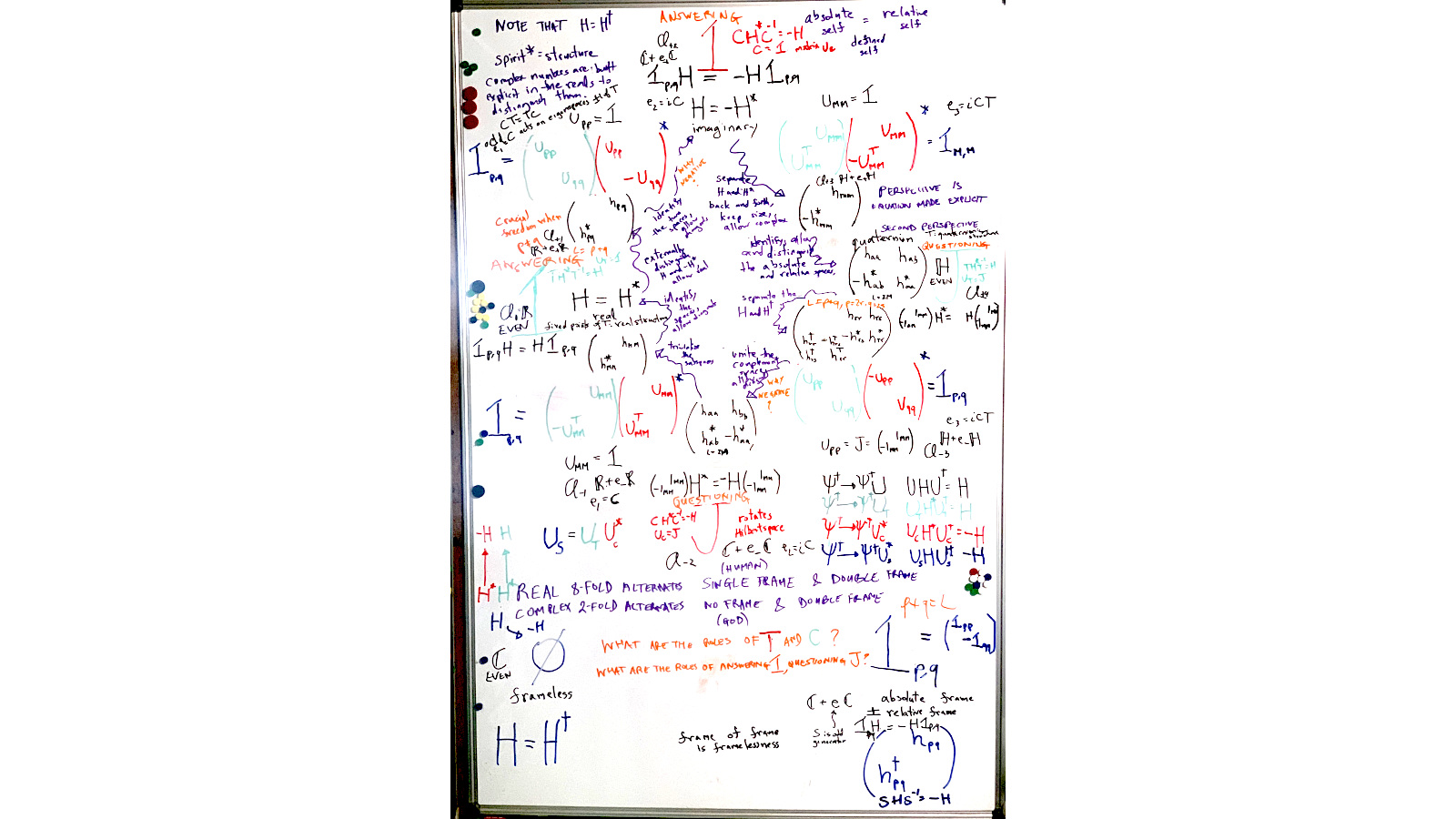 Bott periodicity, VGTU žemėlapis, skaidrės, 2025 m. spalio 28 d., 9:00 val. S6 (SRL-I) 401 An Allegory: The Solipsistic Self as the Hamiltonian of a Noninteracting Fermion Savasties būsenų modeliavimas hamiltoniano 3 kvantinėmis simetrijomis bei Bott periodiškumu Žmogaus vidinis gyvenimas yra sunkiai nusakomas. Kaip jį modeliuoti? Jį pristatome kaip pokalbį tarp trijų sąmoningumo lygmenų, kitaip tariant, trijų protų: atsakančio, klausiančio ir tiriančio, kuriuos žymiu atitinkamai |一, |二, |三. Pasąmonė |一 mums ištisai siūlo vaizdus, patirtis, įspūdžius, nuotaikas, reiškinius, pavyzdžius, galybę atsakymų, ką mes nesąmoningai žinome. Sąmonė |二, atitrūkusi nuo juslių, savo ruožtu pina ryšius tarp sąvokų, žodžių, sampratų, kuriais mes nežinome, užtat sąmoningai klausiame. Visavertis sąmoningumas |三, kuriuo gyvename rūpestingai, apgalvotai, valingai, sulygina pasąmonės žinojimą ir sąmonės nežinojimą, kad galėtumėme viską permąstyti šiais dviem skirtingais pavidalais, užtat bet kokiu atveju rinktis, ar vadovautis nuojauta |一 ar išnagrinėjimu |二. Trijų protų pokalbis įžvelgiamas psichologijoje, neurologijoje, evoliucijoje, o taip pat matematikoje, fizikoje, kibernetikoje bei inžinerijoje: Kalmano filtre, variaciniame autoenkoderyje, laisvosios energijos principe, kvantinėse simetrijose. Atsisakydami visų pasąmonės |一 patirčių bei sąmonės |二 sampratų belieka susitelkti į miglų migloje betūnantį grynų gryniausią sąmoningumą |三, apčiuopiantį pirmaprades proto galimybes, pačias paprasčiausias proto sandaras, viską dalinančius į požiūrius. Atpažįstame būties klausimams reikalingą priešpastatymą (laisvos valios ir likimo), dalyvavimui reikalingą mokymosi ratą (nusistatome, vykdome, permąstome) ir žinojimui reikalingus lygmenis (ar, koks, kaip, kodėl). Galima apibrėžti ir kitus tokius visko padalinimus, o galiausiai pastebėti, kaip subliūkšta aštuntas visko padalinimas, logikos kvadratas, tvirtindamas "visi yra X ir visi nėra X", taip kad santvarka yra tuščia. Užtat visko padalinimai sudaro aštuonių proto aplinkų ratą. Ar toksai ratas pasireiškia matematikoje? Matematikos širdyje, ar tiesiog jos bamboje, yra būtent panašus aštuonių būsenų ratas, realusis Bott periodiškumas, taip pat dviejų būsenų ratas, kompleksinis Bott periodiškumas. Juos galima suprasti dalykiškai kaip Lie algebrų įdėtis o(16r) ⊃ u(8r) ⊃ sp(4r) ⊃ sp(2r) × sp(2r) ⊃ sp(2r) ⊃ u(2r) ⊃ o(2r) ⊃ o(r) × o(r) ⊃ o(r) ir taipogi u(2r) ⊃ u(r) × u(r) ⊃ u(r). Šias įdėtis galima suprasti kaip visko padalinimus tiesinių kompleksinių struktūrų J_1, J_2, ... pagrindu, juos generuojant pagal Stone, Chiu, Roy (2011) receptą. O metafizinę prasmę galima išmąstyti suvokiant, kad abu Bott periodiškumai kartu išreiškia dešimtlypį kelią klasifikuojantį topologinius izoliatorius. Ši klasifikacija išsako kaip nesąveikaujančio fermiono hamiltonianas tenkina trijų kvantinių simetrijų (laiko apsukimo, krūvio sukeitimo, veidrodinio atspindžio) rinkinius, kurių iš viso yra dešimt. Hamiltoniano galimybes išnagrinėja Agarwala, Haldar, Shenoy (2017). Sulyginus šiuos skaičiavimus ir visko padalinimus galima suprasti nesąveikaujančio fermiono Hamiltonianą kaip modeliuojantį mūsų pačių savasčiai būdingas aplinkas, tai yra, būsenas. Šias mintis išdėstau straipsnyje, "An Allegory: The Solipsistic Self as the Hamiltonian of a Noninteracting Fermion" https://www.math4wisdom.com/files/AnAllegory.pdf Andrius Kulikauskas Modeling the States of the Self with 3 Quantum Symmetries of a Hamiltionian and with Bott Periodicity The inner life of a person is difficult to describe. How to model it? We present it as a conversation between three levels of consciousness, in other words, three minds: answering, asking, and investigating. The subconscious |一 continuously offers us images, experiences, impressions, moods, phenomena, examples, a multitude of answers, which we unconsciously know. The conscious |二, detached from the senses, in turn weaves connections between concepts, words, notions, which we do not know, but which we consciously ask. Full-fledged consciousness |三, which we live with care, thoughtfulness, will, compares the knowledge of the subconscious and the ignorance of consciousness, so that we can rethink everything in these two different forms, therefore, in any case, choose whether to be guided by intuition |一 or analysis |二. The conversation of the three minds is seen in psychology, neuroscience, evolution, as well as in mathematics, physics, cybernetics and engineering: the Kalman filter, the variational autoencoder, the free energy principle, quantum symmetries. By abandoning all concepts of the subconscious |一 experiences and consciousness |二, we can only focus on the purest consciousness |三, which lies in the mist of mist, grasping the primordial possibilities of the mind, the simplest structures of the mind, dividing everything into points of view. We recognize the opposition necessary for questions of being (free will and fate), the circle of learning necessary for participation (we determine, we perform, we rethink), and the levels necessary for knowledge (whether, what, how, why). One can define other such divisions of everything, and finally observe how the eighth division of everything, the square of logic, collapses, asserting "all are X and all are not X", so that the system is empty. Instead, the divisions of everything form a circle of eight mental environments. Does such a circle manifest itself in mathematics? At the heart of mathematics, or simply its navel, is precisely a similar circle of eight states, the real Bott periodicity, as well as a circle of two states, the complex Bott periodicity. They can be understood practically as the embeddings of the Lie algebras o(16r) ⊃ u(8r) ⊃ sp(4r) ⊃ sp(2r) × s